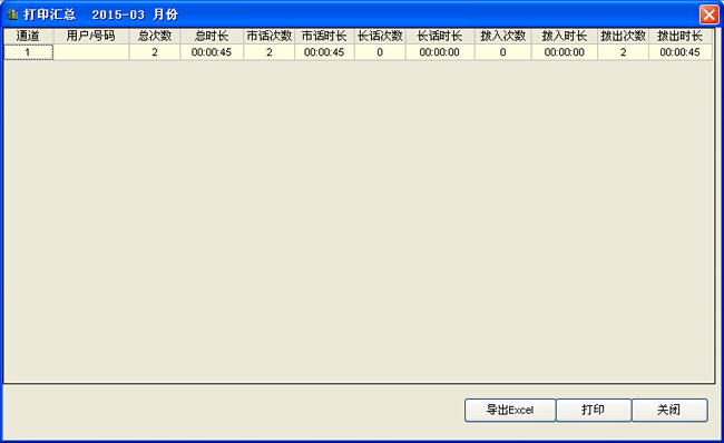 11、打印匯總界面,可按月統計話務人員的呼入次數,呼出次數,通話時長等。