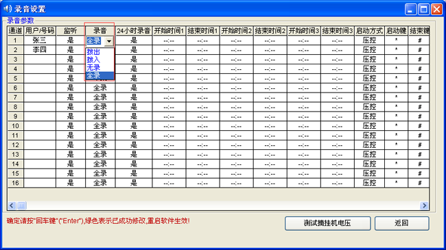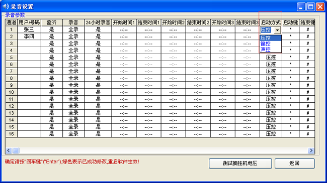 錄音啟動方式靈活,具有壓控、鍵控多種啟動方式,可以是某段時間內錄音,也可以是24小時錄音,錄音起始時間可以靈活設置。