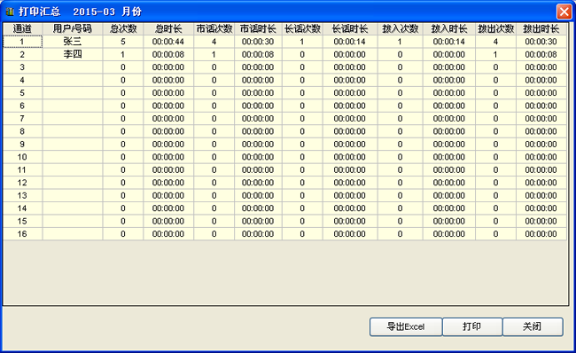 10、打印匯總界面,可按月統計話務人員的呼入次數,呼出次數,通話時長等。