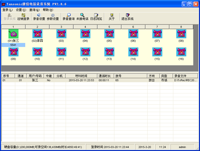 8、錄音查詢界面:用戶可以在這個完成,錄音文件的查詢,播放,統計通話數量,通話時長,備注,導出等功能,也是錄音系統最常用的一個功能模塊。