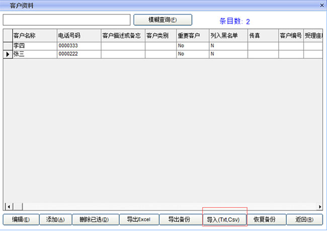 6、客戶資料界面:在這里可以完成對客戶資料的編輯,添加,刪除,導出,導入等操作。