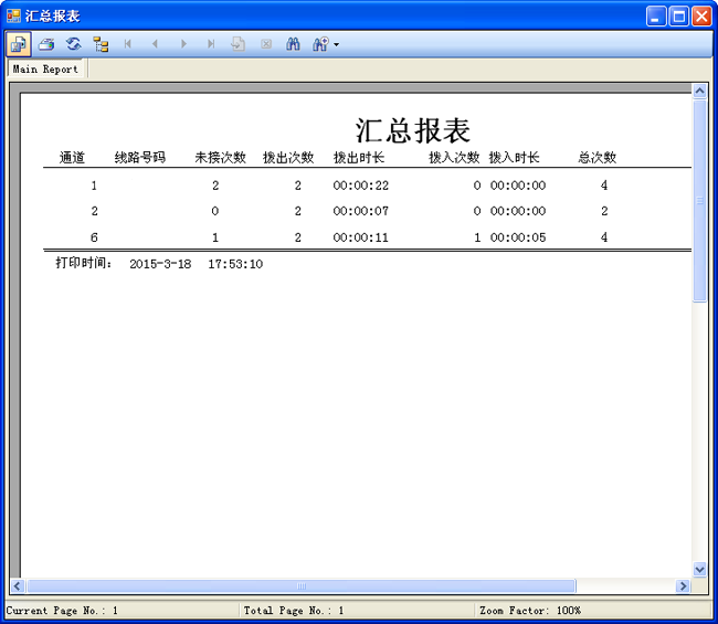 9、打印匯總界面,可按月/天統計話務人員的呼入次數,呼出次數,通話時長等。