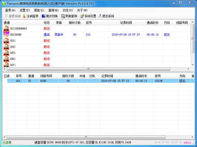 當被監(jiān)聽設備使用時,系統(tǒng)便自動進行錄音,系統(tǒng)把語音信號以數字化語音格式寫入硬盤。同時系統(tǒng)記錄其通話日期、時間和當前通話時間等信息。如果該被監(jiān)聽設備為電話線路,還可以記錄打出電話的外線號碼或打入電話的來電號碼,掛機時系統(tǒng)便會自動停止錄音。