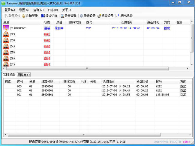 出廠自帶4000G硬盤,1G可以供1條線路錄音35個小時。