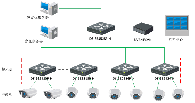 在監(jiān)控場景中,DS-3E2300P-H系列以太網(wǎng)交換機(jī)可作為接入交換機(jī),通過以太網(wǎng)線向攝像頭供電(POE),攝像頭不再需要單獨(dú)部署供電線路,工程安裝非常便利。實(shí)際部署中可依據(jù)接入的攝像頭數(shù)選擇不同端口密度的DS-3E2300P-H交換機(jī),設(shè)備支持線速轉(zhuǎn)發(fā),優(yōu)化的防雷設(shè)計(jì),提供了優(yōu)良的可靠性。