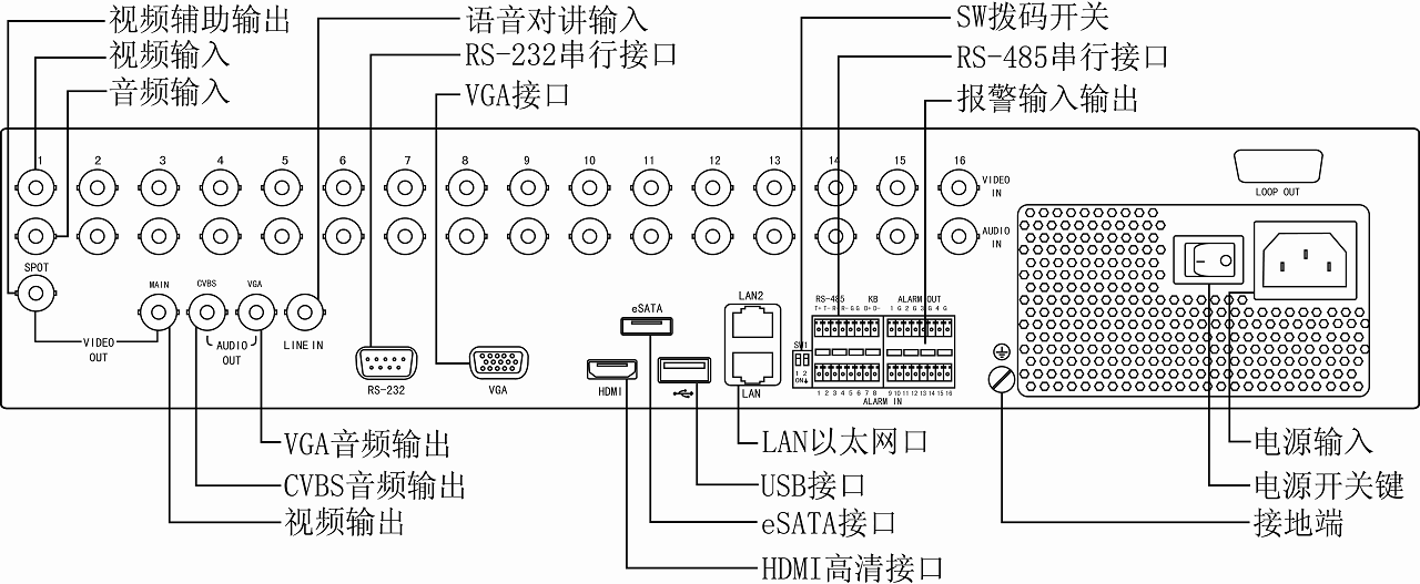 注:DS-8104HW-ST、DS-8108HW-ST后面板與此相似,僅視音頻輸入通道分別為4、8路。