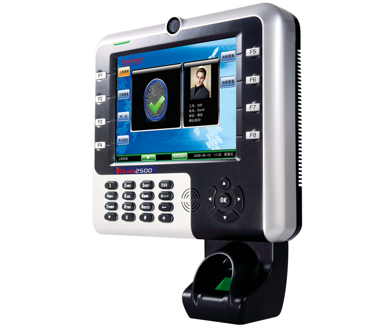 iClock2500 8寸TFT高清晰圖形界面,可顯示個性圖形界面及逼真的人員彩色照片。內置Intel32位處理器,采用中控科技最新版高速混合引擎指紋識別算法,全面提高識別質量,及其機器運行效率。滿足用戶個性需求:射頻卡、指紋、密碼、攝像拍照,可任意組合識別。內置Web server,可以高效的瀏覽。支持TCP/IP協議、100M高速網絡,可實現跨網段數據傳送。支持考勤數據實時傳送,利用穩定的網絡平臺,大大提高了考勤數據的可靠性。