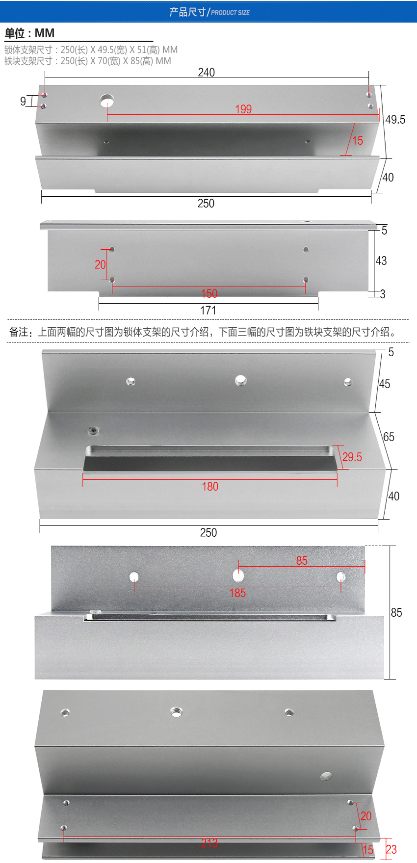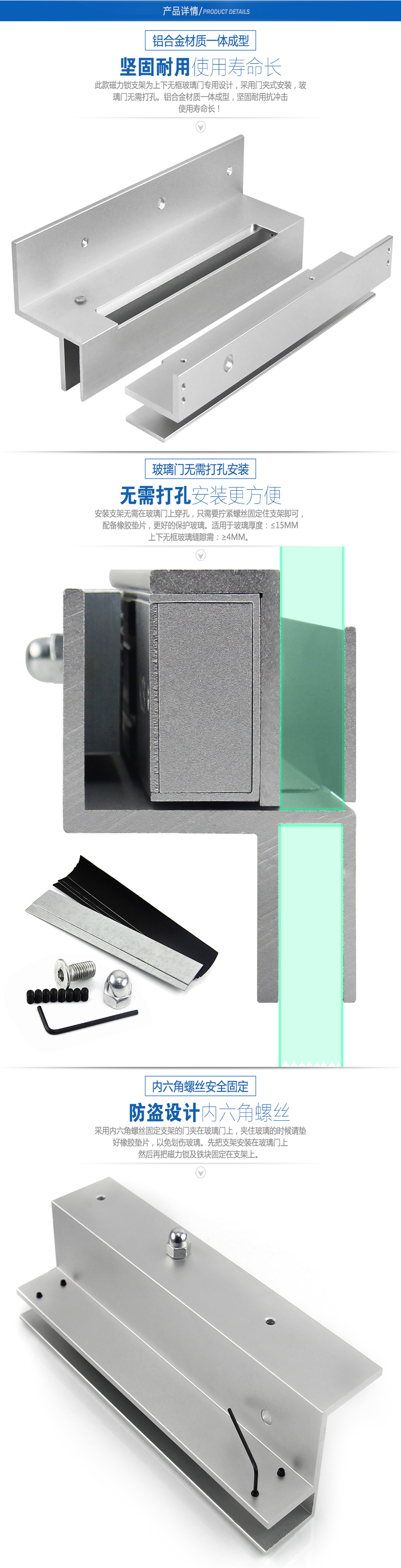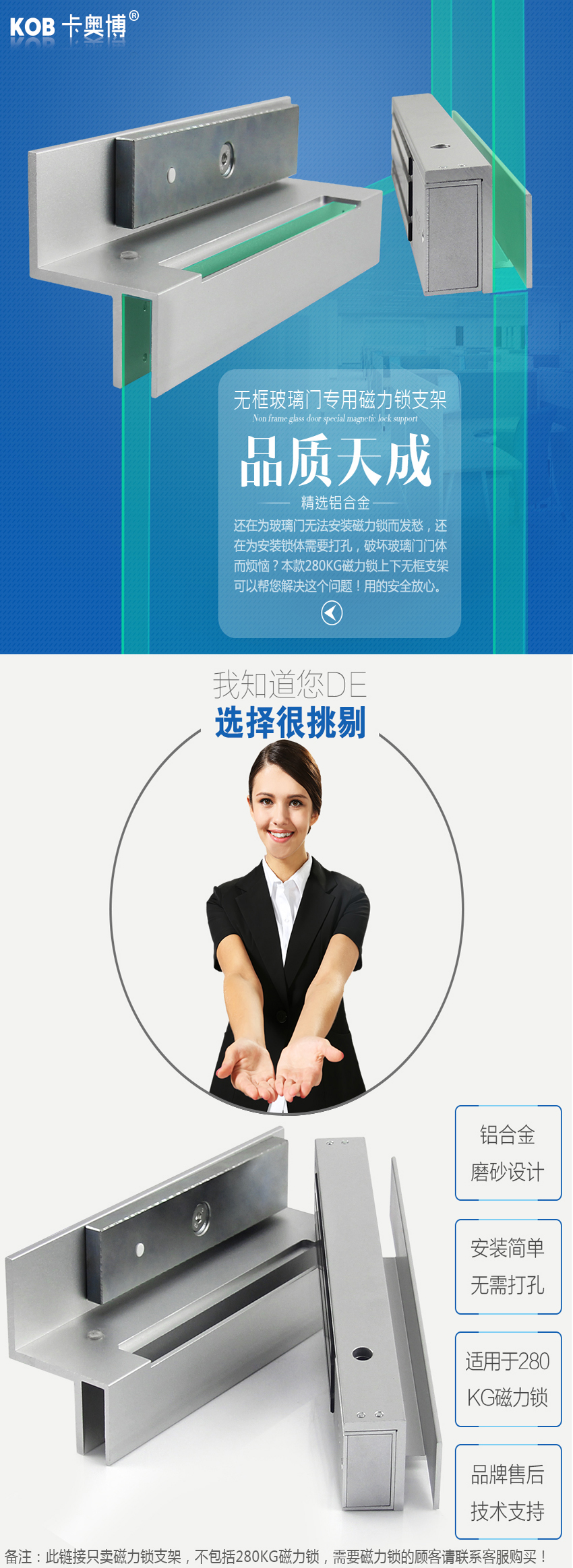 KOB 280公斤U型夾L磁力鎖上下無框玻璃門支架